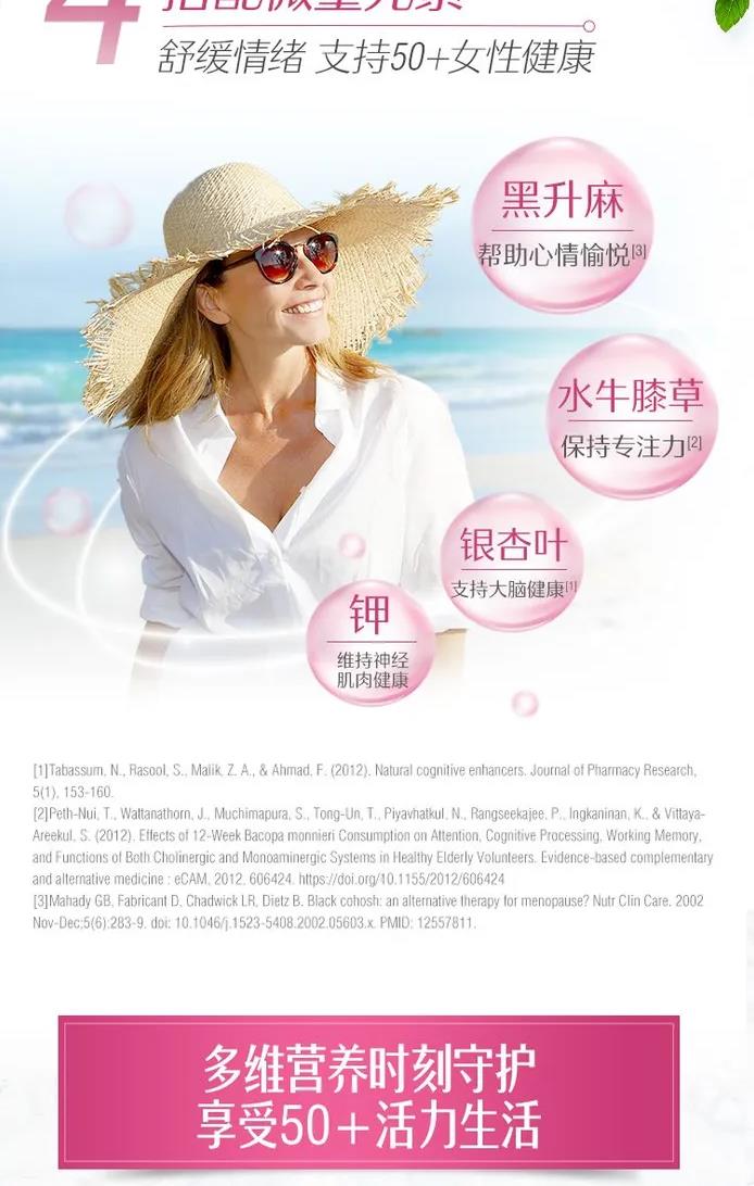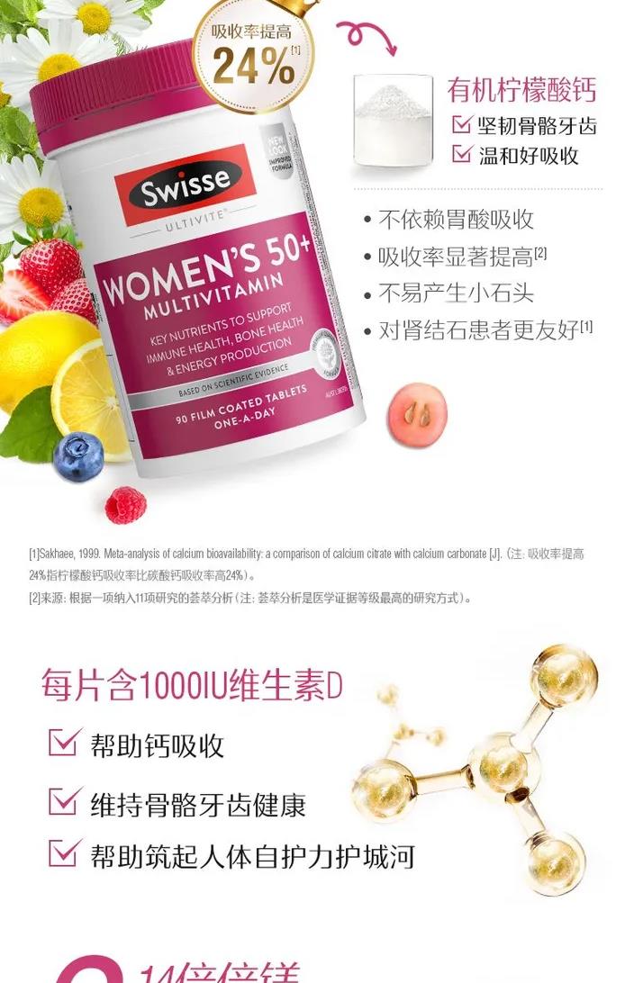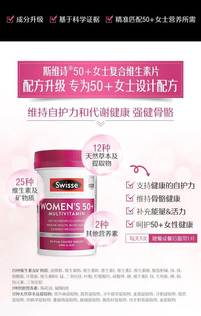 Swisse复合营养片能有效保护心脑血管和记忆功能,提高身体耐久力,改善肝脏功能,平衡神经系统,增强免疫力,保持体内正常循环,调节女性生理机能,帮助五十岁以上女性保持年 轻状态,在生活与工作各方面达到生理和心理的最佳状态,轻松一片令您舒展活力一整天。儿女们关爱母亲等女性家人的最佳选择!