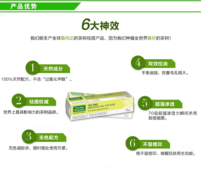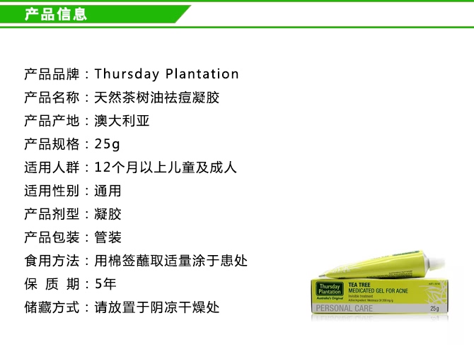 | 英文名称 | Thursday Plantation Tea Tree Medicated Gel For Acne 25g |