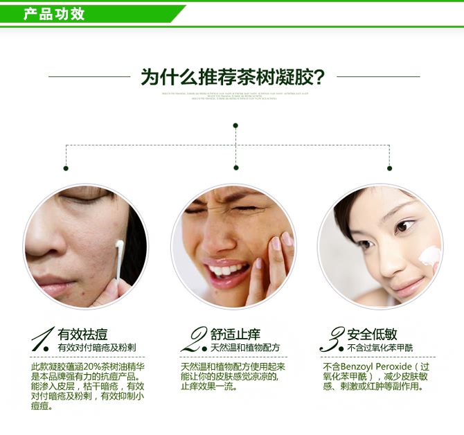 此此款透明凝胶蕴涵20%茶树油精华,能渗入皮层,枯干暗疮,有效对付暗疮及粉剌。不含Benzoyl Peroxide,减少皮肤敏感、剌激或红肿等副作用。能够帮助控制痤疮细菌, 清除毛孔中的脂肪颗粒,黑头,抑制小痘痘的产生。