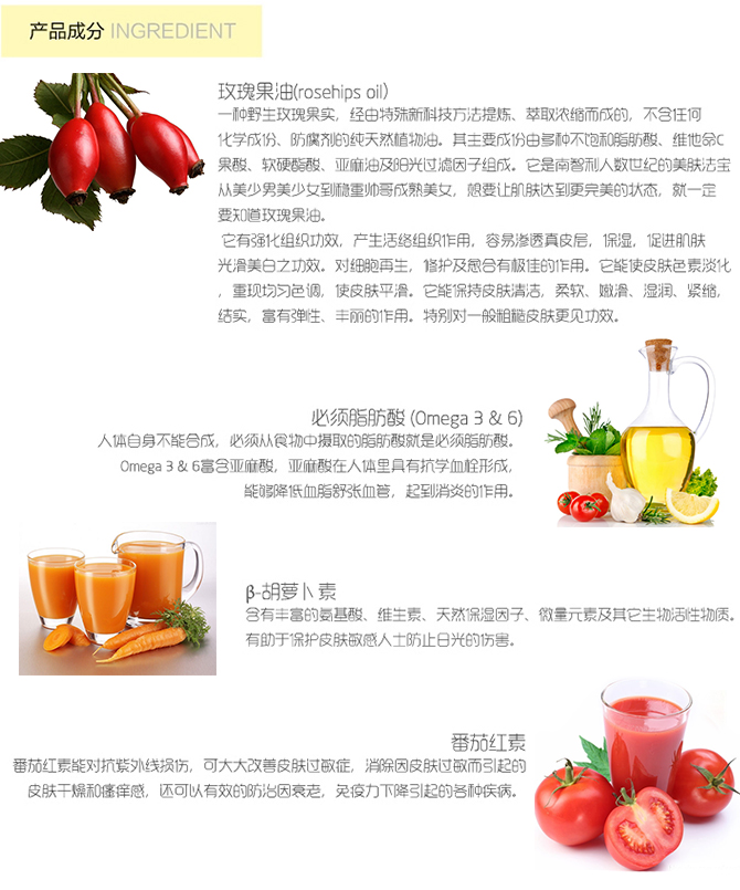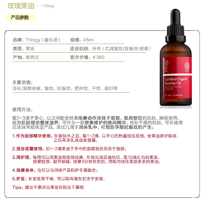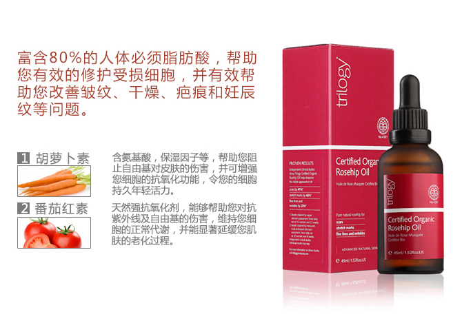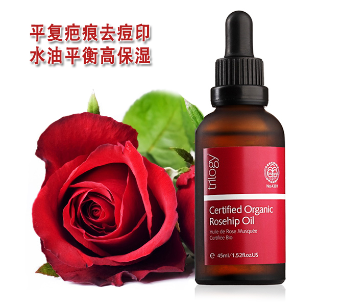 Trilogy纯天然有机纯野玫瑰果油具有深层保湿,美白光滑肌肤,淡化黑色素 , 淡化/消除疤痕,修复再生,提亮肤色,收紧毛孔,紧致轮廓,改善肌肤松弛的功效,让您的肌肤时刻焕发青春光彩