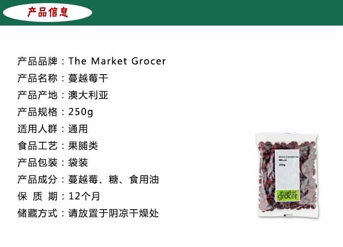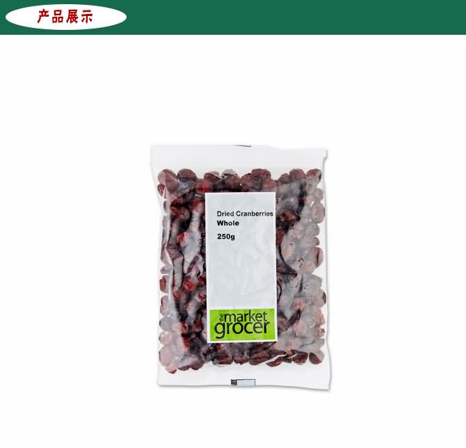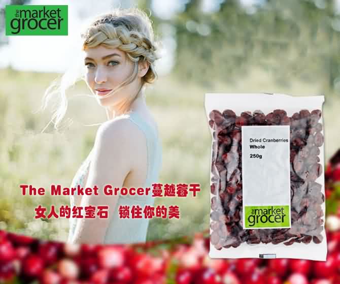the market grocer是澳洲市面上唯一一款整颗蔓越莓干。它好吃、健康、无防腐剂,有效抗癌、抗氧化、对女性内分泌调养大有裨益!玩电脑、看电视来一把,早餐下午茶泡牛奶来一把,做蛋糕制果酱来一把,好吃得根本停不下!